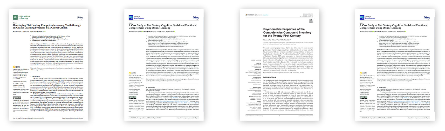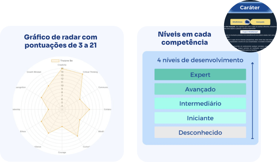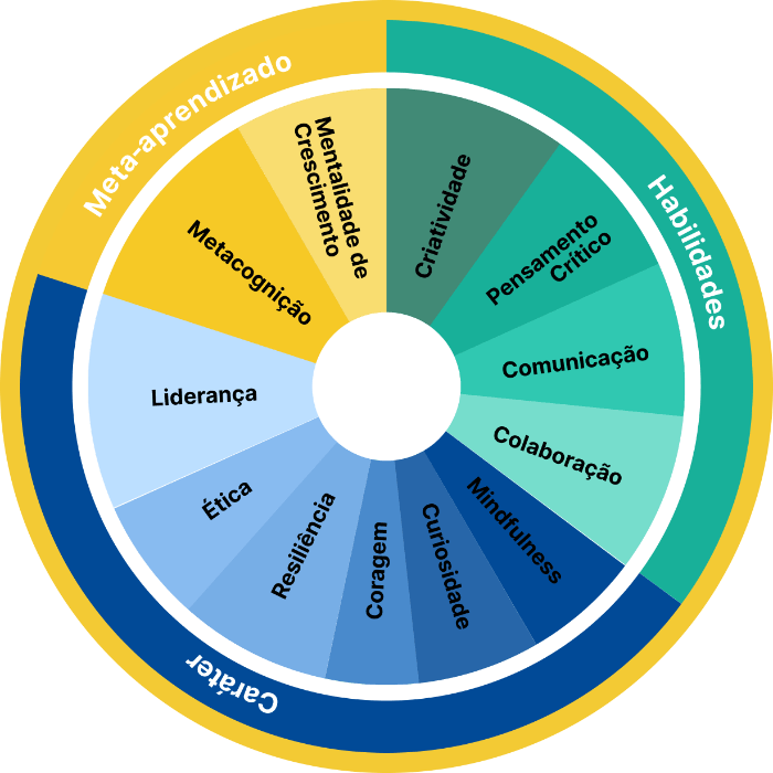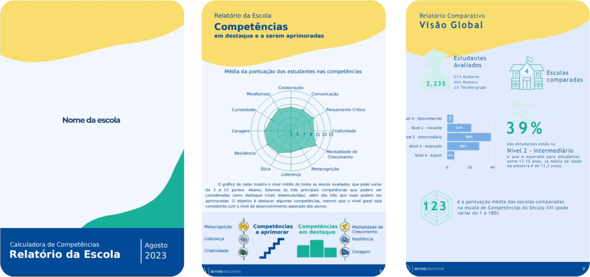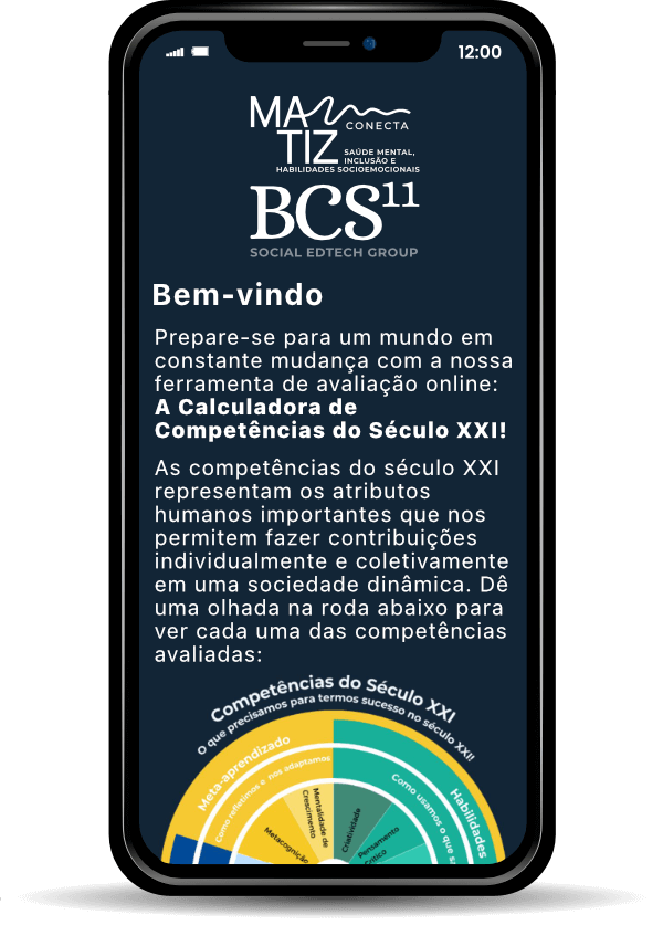 Questionário online de 20 minutos que mede o conjunto das 12 principais competências do século XXI, baseado no Modelo 4D de Charles Fadel (membro do nosso Board of Advisors). Questionário é calibrado de acordo com a idade e contexto do aluno, com um relatório personalizado automático ao fim da avaliação.